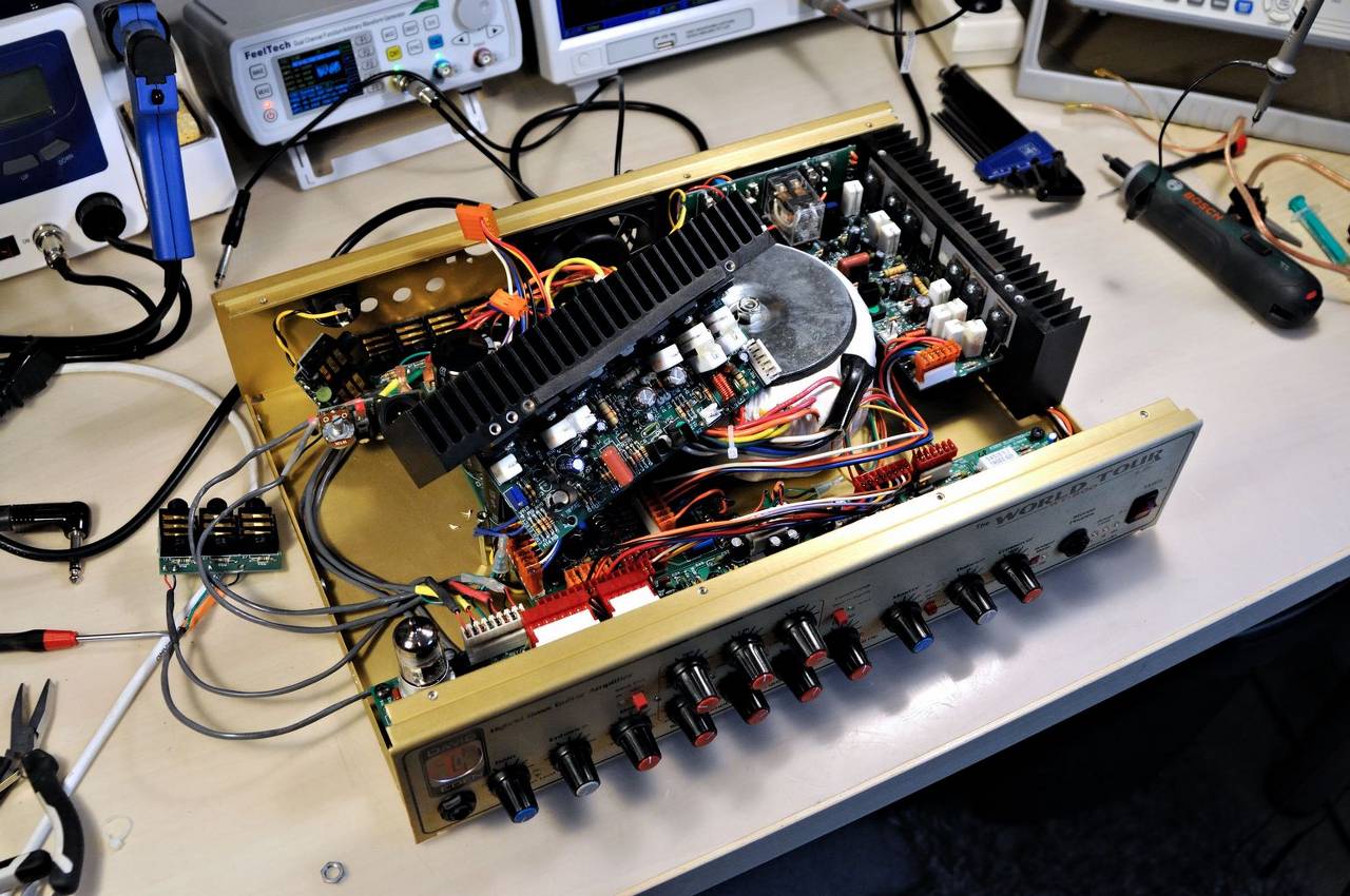 Sygnał z gitary na trafia na wejście lampy 12AX7. I to jest właśnie ta "hybrydowość" WT800. Lampa w tym wzmacniaczy pracuje w dziwacznej konfiguracji. Nie jest to klasyczny stopień wzmacniający jak np w SWR SM900, ale taki "ulampiawiacz" brzmienia, mający za zadanie dodanie "lampowego ciepełka" do brzmienia gitary. Nie uzyskamy na tym stopniu lampowego przesterowania. Prawdę mówiąc układ lampy , jaki zastosował SWR w SM900 bardziej mnie przekonuje.