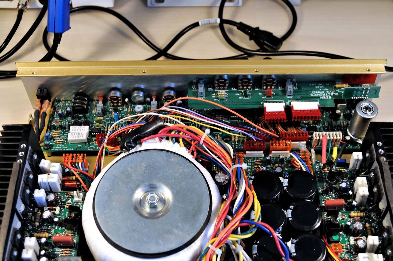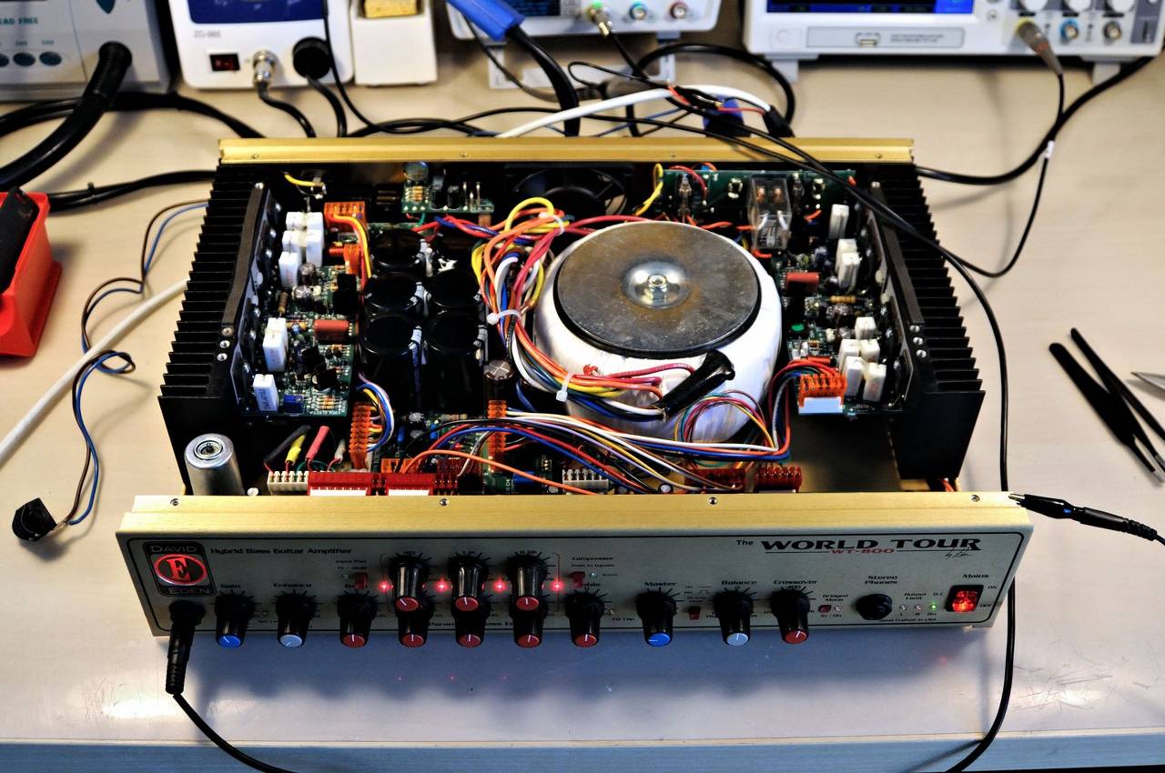 Kiedy ściągniemy górną obudowę z WT800, to na pierwszy "rzut oka" można sądzić, że to jakaś dobra końcówka mocy. Symetrycznie umieszczone bloki końcówek mocy i centralnie zamontowany ogromny toroidalny transformator sieciowy ze sporą baterią kondensatorów zasilacza robią wrażenie. To po prostu "musi grać" !!!! :) .. Porównując WT800 do SM900 widać, że maksyma EDEN'a "Żadnych Kompromisów" zadziałała w 100% i finalnie EDEN WT800 to bezkompromisowa konstrukcja, która w kontekście wydajności deklasuje SWR SM900, którego Fender niestety trochę "zeszmacił".. A szkoda...